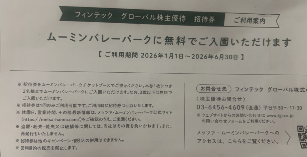 実は1万株持っていれば、ムーミンバレーパークの招待券がもらえます。